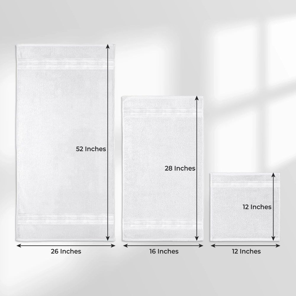 The set includes 26”x52” regular bath towels, 16”x28” hand towels, and 12”x12” face towels, catering to various needs within your establishment.